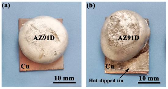 Figure 11 shows the macroscopic wetting morphology between the AZ91D and Cu substrate. The surface of the AZ91 and Cu matrix was almost not wet in Figure 11a, but Figure 11b shows obvious wetting on the upper and lower right side of the contact between the AZ91 and Cu matrix. Therefore, HDTC treatment can promote combined AZ91D/Cu interfaces.