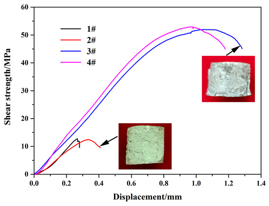 Stress–displacement curves are shown in Figure 14. Samples 1# and 2# are AZ91D/Cu bimetallic samples. Samples 3# and 4# are AZ91D/HDTC-Cu bimetallic samples. Table 4 shows the shear strength average values obtained from the current AZ91D/Cu and AZ91D/HDTC-Cu. The interfacial shear strength of the AZ91D/Cu bimetal in this study is consistent with the results obtained by Xu et al. [37], and the AZ91D/HDTC-Cu bimetallic sample was close to that of the Zn, Cu, and Ni interlayers used in another Mg/Al bimetal composite casting experiment [44,45,46]. The interfacial shear strength of the AZ91D/Cu significantly increased after the HDTC treatment.