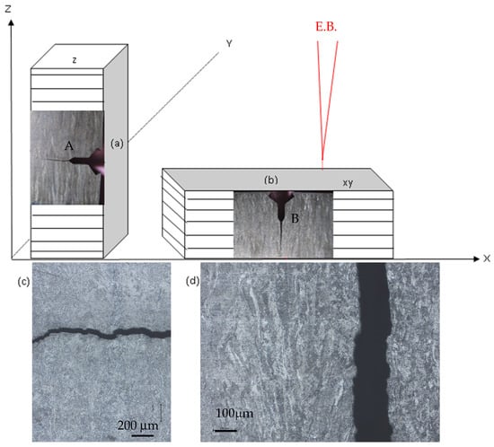 Schematic illustration of the notch orientation with respect to the axis of printing (the red rays) on the background of the material macrostructure (a,b). Close up of the crack propagation through the microstructure: (c) area A in the z orientation and (d) area B in the x-y orientation.