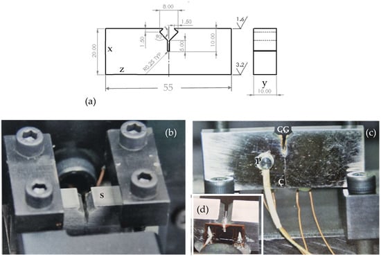 (a) Drawing of a specimen for bending fatigue. x, y, z are the coordinates used in Figures 3 and 7–9. (b,c) A test specimen (S) mounted in the RUMUL fatigue machine (at the end of the experiment when the crack (C) crossed the specimen). An AE probe (P) is mounted to the specimen and a crack gage foil (CG), mounted on the back side, is shown in (d). A COD was also used during the test.