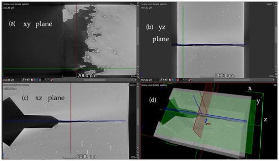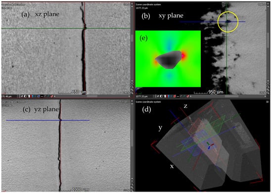 The path of another crack is shown in Figure 9. Figure 9a–c shows a crack in three perpendicular sections produced by µCT. Figure 9e shows the localized von Mises stress concentration associated with the defect mark in Figure 9c. This defect caused the deviation of the crack path as evident from Figure 9a,c.