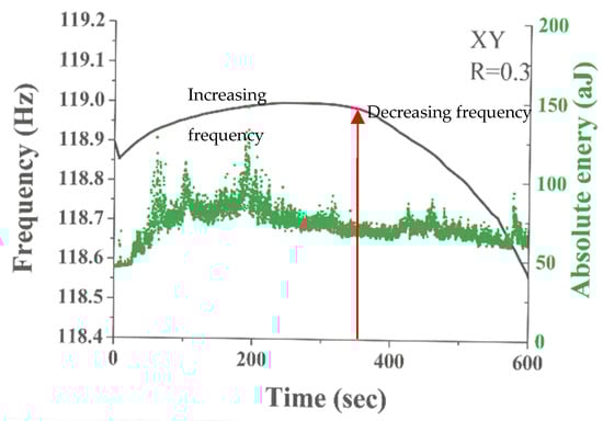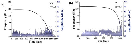 Resonance frequency (black line) and AE amplitude (blue dot) vs. time at R = 0.3: (a) XY orientation and (b) Z orientation.