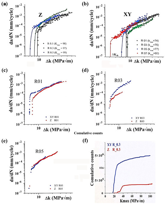 FCPR vs. ∆K in the two orientations: (a) effect of stress ratio on Z-oriented specimens and (b) effect of stress ratio on XY-oriented specimens. Effect of stress ratio for Z/XY: (c) R = 0.1; (d) R = 0.3; and (e) R = 0.5. (f) AE cumulative counts vs. Kmax for the two orientations at R = 0.3.