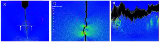 Finite element simulations were adopted to study the interaction between the defects and the front of the propagating crack. Figure 8 shows the interaction of a fatigue crack with defects in a specimen with an XY orientation. The crack encountered defects which affected the crack path and caused local deviations or bifurcations (Figure 8b,c). The deviations may be attributed to the local stress concentrations caused by the defects, as can be interpreted from the calculated von Mises stresses and the force lines.