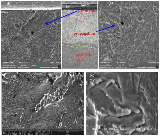 Fractography of fatigue crack growth. (a) Typical general view of the fatigue crack and the transition to overload fracture. Images (b) and (c) show fatigue crack propagation through voids. Typical fatigue striations in a Z specimen (d) and in a XY specimen (e).