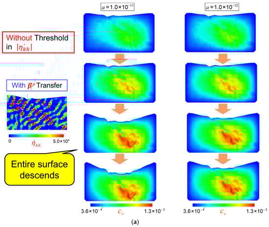 Results of indirect CP-FEM-diffusion coupling analyses for the groove–crack transition process using the proposed vacancy production model. The figure compares three conditions with and without -threshold and -information transfer, along with the effect of the conversion rate a: (a) without a threshold in and with information transfer, (b) with a threshold in and information transfer, and (c) without a threshold in and information transfer.