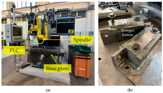 The joints were produced in accordance with [18], under controlled laboratory conditions, with standard temperature and humidity levels, ensuring consistency in the welding environment, using a 3-axis ESAB LEGIO™ 3ST FSW machine (OEMER Motori Elettrici, Rescaldina, Italy—Figure 1a), where the aluminum plates (i.e., skin and stringer) were fixed with a clamping device (see Figure 1b) [29]. This equipment, similar in structure to a manual milling machine, benefits from force-controlled operation in addition to positional control, enhancing the precision of the friction stir welding (FSW) process. The machine operates under a PLC (Programmable Logic Controller) interface, which provides real-time control and data recording for variables such as applied force, spindle resistance torque, displacement along the z and x axes, spindle current, and spindle power.