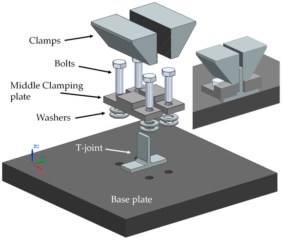 The T-joint setup for this study employs two aluminum alloys, i.e., AA6082 and AA5083, both with a thickness of 6 mm. The sizes are, respectively, 100 mm × 70 mm and 100 mm × 50 mm. The skin component is fabricated from AA6082, an aluminum–silicon–magnesium–manganese alloy from the 6000 series, known for its versatile use in general applications. AA6082 offers high mechanical strength, positioned among the highest in its series, with good corrosion resistance, excellent weldability, and machinability, making it suitable for sheets, plates, bars, tubes, and profiles. It is typically available in the T6 temper, with other tempers upon request. This alloy is frequently used in automotive and rail construction, as well as in structural and architectural components where high corrosion resistance is a key requirement. The stringer is constructed from AA5083, an aluminum–magnesium alloy valued for its outstanding oxidation and corrosion resistance, though with moderate mechanical strength and good formability. AA5083 is also weldable by fusion and retains high toughness at both ambient and low temperatures. This alloy is commonly available in the 0/H111 temper for maximum formability and in the H22 temper, which balances formability with increased strength. AA5083 finds wide application in marine and cryogenic structures, pressure vessels, tankers, panels, wheels, and other components requiring fatigue resistance and good durability in corrosive environments without the need for high static mechanical strength. It is a suitable choice for components to be integrated into welded assemblies.