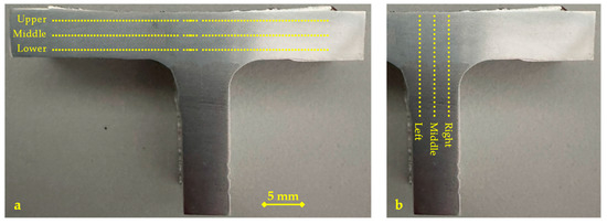 Figure 5a reports the test plan for the direction along the skin. The measurements were conducted along three parallel lines: upper, middle, and lower, including about 44 measurements for each line. Figure 5b reports the test plan for the direction along the stringer at the interface between the two alloys. The measurements were conducted along three parallel lines: left, middle, and right, including about 23 measurements for each sample.