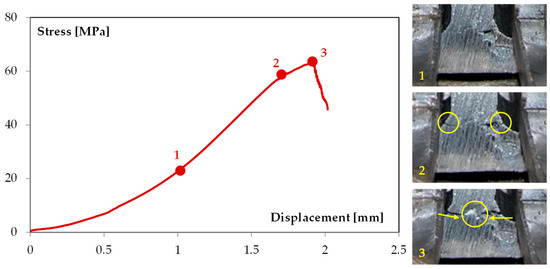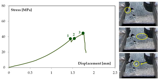 This representation provides insight into the material’s behavior under load and highlights the influence of internal defects, particularly wormholes, on the fracture mechanism. Also in this case, it is possible to observe several steps:
