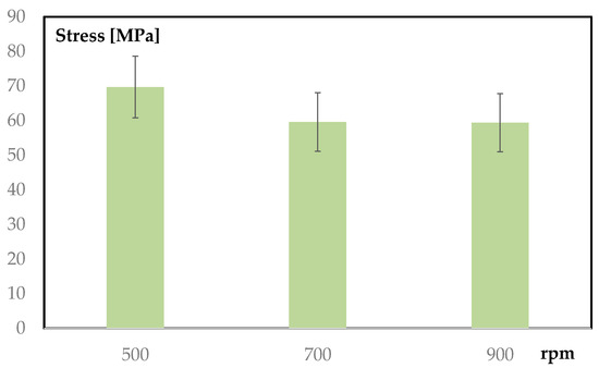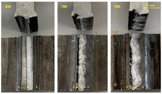 The comparative analysis of joint strengths for samples welded at rotational speeds of 500, 700, and 900 rpm (Figure 9) reveals a notable dispersion in the data. Despite the scatter, the results indicate that joints welded at 500 rpm generally exhibit higher strength due to better material flow and fewer defects, such as wormholes. This highlights the critical influence of rotational speed on joint quality.