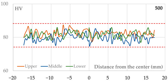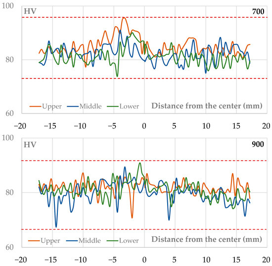 The microhardness profiles along the skin direction for samples welded at rotational speeds of 500, 700, and 900 rpm exhibit distinct characteristics, reflecting the microstructural changes induced by each welding parameter, as illustrated in Figure 11 where each point represents the value of an individual indentation along the three measurement lines (upper, middle, lower).