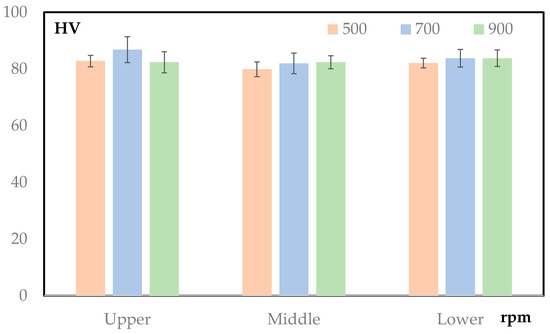 For the 500 rpm sample, the average hardness values across the upper, middle, and lower lines are closely aligned, with minimal variation and error bars. This uniformity confirms a stable and homogeneous microstructure in the SZ. The controlled heat input at 500 rpm ensures effective plasticization without overheating, leading to well-distributed mechanical properties throughout the SZ. For the 700 rpm sample, a slight increase in average hardness is observed compared to the 500 rpm sample, particularly for the upper and middle lines. However, the error bars suggest more variability in hardness among the three measurement lines. This indicates that while the material experiences higher heat input at this rotational speed, it may introduce microstructural inconsistencies and localized hardness fluctuations within the SZ. For the 900 rpm sample, the hardness values are comparable to the 700 rpm sample, but the error bars are slightly larger, reflecting increased variability. This suggests that the excessive heat input at 900 rpm disrupts the uniform mixing of materials in the SZ. Overheating may result in grain coarsening and localized softening, leading to reduced microstructural stability.
