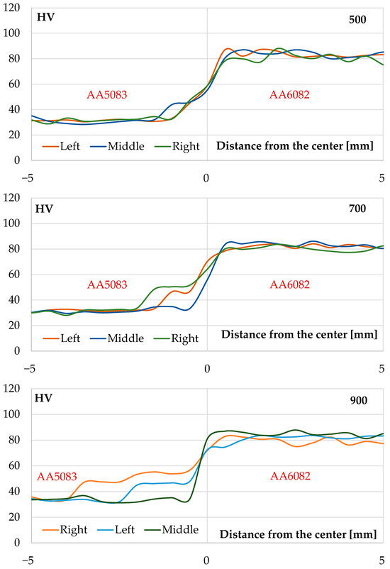 For the 900 rpm sample, the profiles at 900 rpm exhibit the most abrupt transition, with hardness values sharply increasing from 40 HV to 80 HV within a very narrow zone. Significant discrepancies between the left, middle, and right lines highlight inconsistent material behavior at this rotational speed. This irregularity is indicative of localized overheating and turbulent material flow, which inhibit effective inter-diffusion between AA6082 and AA5083. The distinct separation of the three curves suggests a lack of uniformity in the interface, likely resulting in higher stress concentrations and structural weaknesses in the joint.