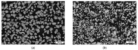 Plasma spray coatings were obtained with feedstock obtained by mixing two different powder stocks. The first ones were atomized AlSi10Mg (IMR, metal powder technologies GmbH, Velden am Wörther See, Austria) powders with nominal sizes of 20–63 μm [50]. The Sn powders, supplied by Metalpolveri S.r.l (Gussago, Italy) as Sn106, were characterized by a wider size distribution (>106 μm: 0.1%; >45 μm: 15–45%; <45 μm: 55–85%) [40] in the as-received condition. Their chemical composition is reported in Table 1. The powders were sprayed on AA 6063 substrate (nominal composition Al-0.6Mg-0.4Si, in annealed condition), obtained from 100 × 200 × 3 mm plates. The substrate was sandblasted with white corundum at a pressure of 6 bars, at a distance of 150 mm and an angle of 70°. The described procedure created a mean surface roughness of 6.3 μm, in order to enhance the efficiency of the process.