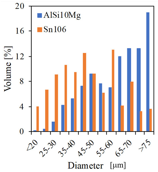Figure 4 represents powder granulometry expressed in terms of powder volume percentage, computed on the basis of their equivalent diameter. This quantity is calculated as the diameter of a perfect sphere whose area is equivalent to that of the powder particle. The histogram presents the broader distribution of the Sn106 powders with respect to one of AlSi10Mg, whose distribution tends to higher equivalent diameter values, coherently with what is shown in Figure 3a,b. In this sense, Sn presents a higher percentage of smaller particles with respect to AlSi10Mg powders.