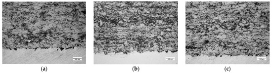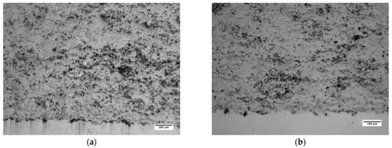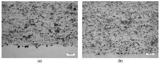 On the other hand, in addition to the aforementioned porosities, identified in Figure 6 as the dark black spots, other defects can be observed, such as discontinuities among the splatted powders, as well as the presence of unmelted AlSi10Mg powders, recognizable by their quasi-spherical appearance. In this sense, optimization of the process parameters should be useful in further enhancing the quality of the coating.