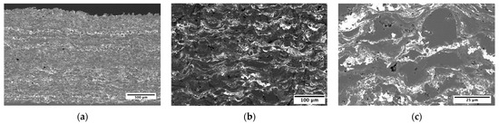After the first heat treatment, no detachments between the coating and the substrate were observed (Figure 9a). Some changes with respect to the as-produced coating were in any case observed, both at the ‘external’ and ‘inner’ level.