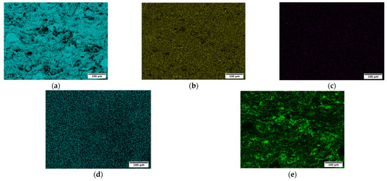 EDS maps (Figure 13) represent the elements’ distributions in the bulk of the ten-times heat-treated coating. The situation presented is very similar to the one of the as-produced coating (Figure 7). The miscibility gap nature of Al–Sn system is highlighted again by the complementarity of Figure 13a,e. This latter underlines once more the tendency of Sn to become spheroidized if subjected to cyclic heat inputs, already detected in the previous micrographs (Figure 12). As far as the other elements are concerned, i.e., Si (Figure 13b), Fe (Figure 13c) and Mg (Figure 13d), no qualitative differences can be observed with respect to the as-produced condition. Although their formation was predicted by the CALPHAD-based calculations (Figure 2), no traces of Al9Fe2Si2 and Mg2Sn were observed.