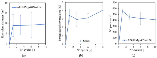 The percentage of covered area, from the initial increase up to about 4%, first stabilizes and then slightly increases as the number of heat cycles proceeds, testifying the capability of Sn to slowly flow out of the matrix. On the other hand, the trend in the number of Sn droplets increases after the first cycle and then decreases. This could be related to several concurrent factors: the presence of some bigger droplets together with the tendency of the smaller ones to reduce, and the increasing presence of the wire-like particles. Further, the detachment of Sn spheres after some cycles caused by the low adhesion between the exuded Sn spheres and the oxidized Al surface may have played a role.