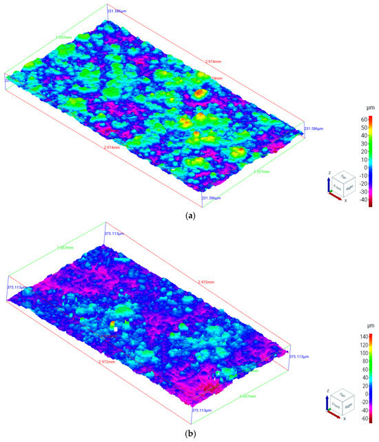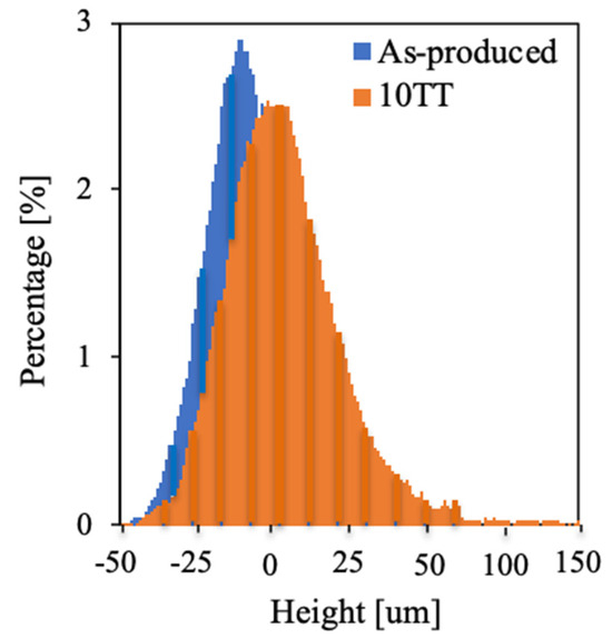 The surface profiles of the as-produced and 10-times cycled AlSi10Mg-40% mass Sn coating are compared in Figure 17. The visual comparison should take into account the different color scales in the two cases: −40–60 μm for the as-received sample and the −40–140 μm scale for the thermally cycled one. A more irregular and inhomogeneous distribution is observed for the heat-treated sample with respect to its as-produced counterpart. Moreover, roughness values are spread over a larger distribution in the case of the 10-times cycled one, as represented by Figure 18. This is quantified by the average height and the root mean square height parameters of the analyzed area presented in Table 4 (Sa and Sq, respectively). This, in general, reflects higher values for the maximum peaks and valleys in the case of the heat-cycled coating, as also stated by the Sp and Sv parameters, respectively (Table 4). While the maximum valley depths are closer (43 and 53 μm), the peak value, approximately corresponding to the presence of a large droplet, are more than double in the thermally cycled sample. These results are consistent with the presence of surface droplets of tenths of micrometers in diameter. The heat-treated sample’s surface possibly experiences severe stresses related to the expansion/shrinkage of the Sn regions below the surface as well. Further, the height distribution for the heat-treated sample presents higher skewness (Ssk), highlighting the shifting of the distribution towards the valleys’ values, consistent with what can be observed in Figure 17b. Moreover, the roughness values are spread over a larger distribution in the case of the 10-times cycled one, as represented by Figure 18.