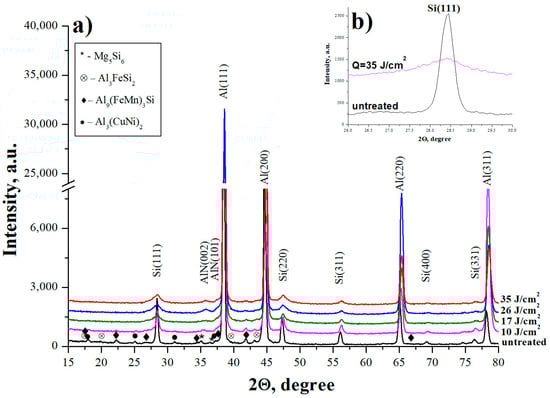 There are a number of ways to generate plasma flows and high-energy particle beams, particularly in ion–plasma deposition systems [36,37,38]. Treatment by high-energy particle beams in a melting mode is a prospective method of aluminum–silicon alloy modification [26,30]. The melting of surface layers followed by crystallization in conditions of high cooling speed leads to the strong dispersion of near-surface microstructures, the dissolution of primary silicon crystals and intermetallic compounds and the formation of metastable phases, thus resulting in mechanical property improvement [26,28,29,30,31,32,33,34,35]. In particular, it was reported that the treatment of an (Al-10%Si-2%Cu)-alloy by an intensive pulsed electron beam with a beam energy density of 10–50 J/cm2 led to the dissolution of silicon, the formation of a sub-micro-sized crystal structure of high-speed cellular crystallization forms and the saturation of an Al-based crystal lattice with alloying and impurity elements [7]. The microhardness value after the treatment was 1.6 times higher than that of the untreated material as a result [7]. The sizes of aluminum solid-solution grains depend on the chemical composition of the alloy and the treatment regimes. In [29], it was found that high-intensity electron beam treatment led to the formation of aluminum-based solid solution grains with sizes of 100–450 nm in an (Al-10.65%Si-2.11%Cu)-alloy and grains with sizes of 40–100 nm for an (Al-5.39%Si-1.33%Cu)-alloy. In addition, the formation of silicon nanocrystallites with sizes of 5–10 nm on the grain boundaries was revealed [29].