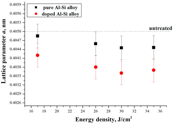 Solid-solution strengthening after the plasma treatment of silumin is primarily associated with the formation of a supersaturated Al (Si) solid solution. However, as illustrated in Figure 2, the aluminum lattice parameter changes remain within the error limits. Thus, it can be concluded that while the solid-solution mechanism can influence the microhardness of the samples after CPF impact, it is not the primary mechanism explaining the increase in microhardness at 35 J/cm2.