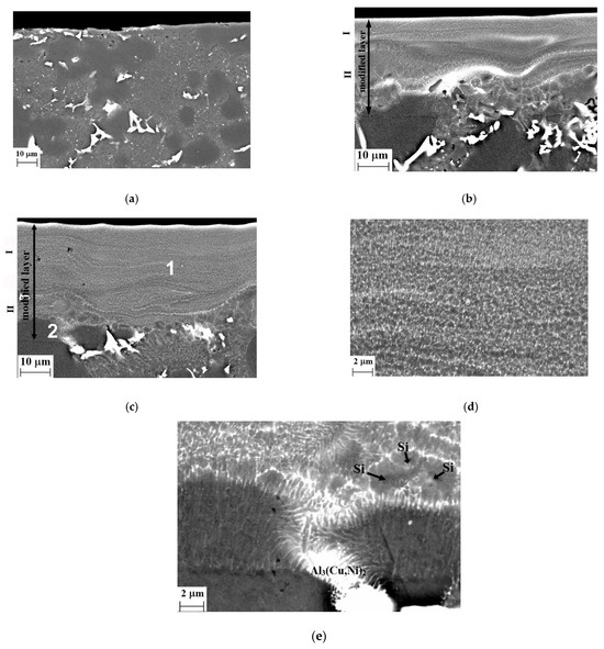 SEM images of silumin sample cross-sections: (a) untreated; (b) after CPF treatment at absorbed energy densities of 17 J/cm2 and (c–e) 35 J/cm2.
