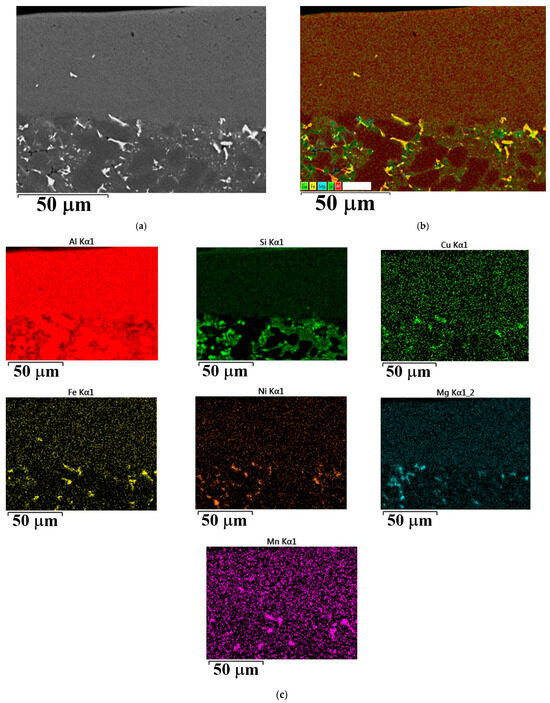 (a) Microstructure of the silumin sample cross-section, (b) summarized distribution of elements and (c) distributions of individual elements after plasma impact at 35 J/cm2.