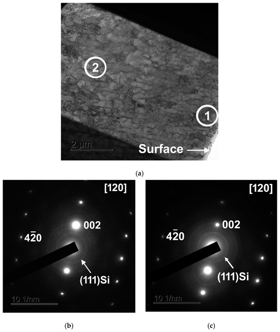 (a) Bright-field image of the sample treated with CPF at 35 J/cm²; (b) corresponding SAED pattern from local areas marked as 1; (c) corresponding SAED pattern from local area marked as 2.