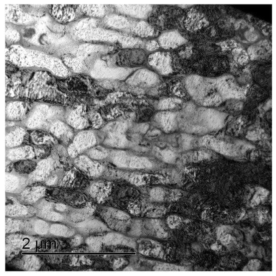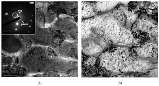 An area of the studied lamella at higher magnification is shown in Figure 7. It is evident from the figure that aluminum grains are predominantly elongated along the axis perpendicular to the surface. The grain size varies within the range of 100–500 nm, which corresponds to the size of the aluminum crystallites observed using the SEM method (see Figure 4d). A comparison of the diffraction patterns (see Figure 6b,c) and the grain structure shown in Figure 6 allows us to conclude that the grains are primarily oriented along the crystallographic <100> direction, which corresponds to their growth during crystallization. The preferential growth in the <100> direction under conditions of high-speed cooling from the melt is typical of materials with a face-centered cubic lattice [57]. This <100> direction provides the maximum growth rate of the crystal when aligned closely with the direction of the heat sink during high-speed cooling [58].