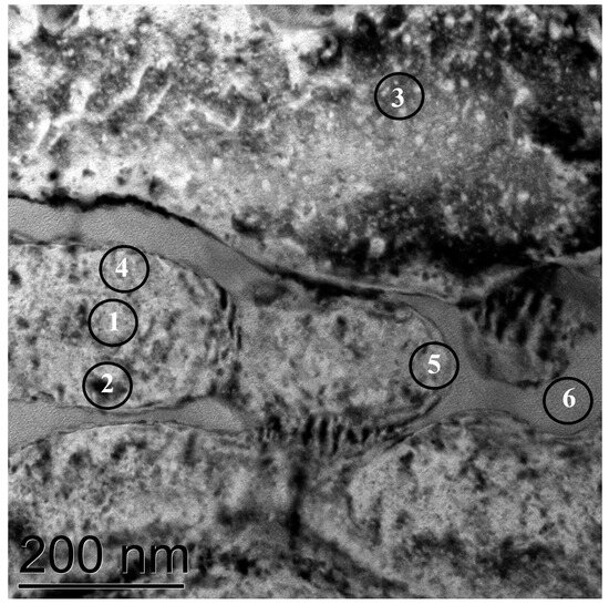 Table 1 shows the composition of different regions (inside the solid solution grains, and in the interlayer between the grains, at the grain–interlayer boundary) designated by the corresponding numbers in the bright-field image in Figure 9. A comparison of the table and figure data indicates that the silicon concentration inside the grains corresponds to ~3 at.% Si (areas 1 and 3), which correlates with the data presented in Figure 2. This suggests that the central part of the grains consists of a supersaturated solid solution of ~3 at.% silicon in aluminum. The solid solution may also contain other alloying elements at concentrations lower than the detection limit of energy-dispersive microanalysis. The table indicates that the remaining silicon, along with other alloying elements, is carried by the crystallization front to the boundaries of the growing grain, forming an interlayer between the grains. The boundaries of the grains are enriched with silicon and magnesium (areas 4 and 5). The interlayer, in addition to aluminum and silicon, contains nickel, magnesium, iron and manganese (area 6). The composition of the interlayer corresponds to a hypereutectic alloy of aluminum, in which nanosized silicon precipitates are formed (see Figure 8). This interlayer creates a rigid framework around the grains of the supersaturated solid solution of aluminum with silicon, enhancing the strength characteristics of the surface layer.