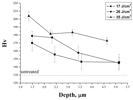 Structural-phase transformations in the surface layer caused changes in the strength properties of the studied alloy (Figure 10). The microhardness of the untreated alloy was 130 Hv. CPF treatment increased the microhardness of the surface layer, reaching a value of 205 Hv at a depth of 1.5 μm before decreasing to ~180 Hv at greater depths following treatment at 35 J/cm2 (Figure 10). For samples treated at lower absorbed energy densities, the maximum microhardness of the modified layer ranged from 170 to 180 Hv. The microhardness of the treated samples at greater depths remained higher than that of the untreated samples. The increase in microhardness at lower indentation loads (closer to the surface) can be attributed to the formation of AIN during plasma impact.