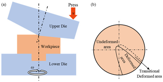 Ti-6.5A1-3.5Mo-1.5Zr-0.3Si (TC11) is a typical two-phase titanium alloy with excellent thermal strength properties below 500 °C and high room temperature strength, thermal stability, corrosion resistance, and creep resistance. Currently, its major use is in the manufacture of blades, fasteners, rings, and compressor disks for aeroengines [1,2,3]. The design of monolithic structures has become the preferred choice, as the size and complexity of these components continue to increase, and near-net-shape technology has become mainstream [4]. Nevertheless, it is difficult for existing molding equipment to meet the gradually increasing part sizes, and it is particularly important to develop new forming methods [5]. Swing rolling technology provides distinct advantages in the forging of large disk and shaft rotary bodies, notably reducing applied loads while enhancing efficiency. This advanced forming process effectively mitigates several inherent limitations, including simplistic structural configurations, inadequate thermal resistance, susceptibility to deflection forces, and insufficient forming loads. A novel energy-saving forming technique, axial closed die rolling (ACDR), is put forward, which is suitable for the precise forming of difficult-to-deform materials. The ACDR has a relatively simple motion pattern. During forming, the upper mold unit is stressed in the axial direction, and the lower mold unit is actively rotated in the circumferential direction. At the same time, the passive rotation of the upper die assembly under the action of rolling friction causes it to achieve continuous local forming on the upper workpiece surface [6,7]. The principle of the ACDR forming is shown in Figure 1 [7]. Compared to upsetting, the ACDR forming incorporates compressive and torsional deformations, constituting a three-dimensional plastic deformation technique; this forming method can greatly eliminate the deformation dead zone in upsetting forming. At the same time, the addition of torsional deformation can make the organization deformation more uniform. The Hall-Petch empirical states that a finer grain size improves the plasticity and toughness of the alloy, while also increasing its strength [8]. The ACDR forming effectively reduces the grain size, thereby enhancing both the strength and plasticity of the material. Moreover, the ACDR forming technology belongs to incremental volume forming, and its cyclic forming method can achieve larger-sized and thinner-thickness workpieces under small load.