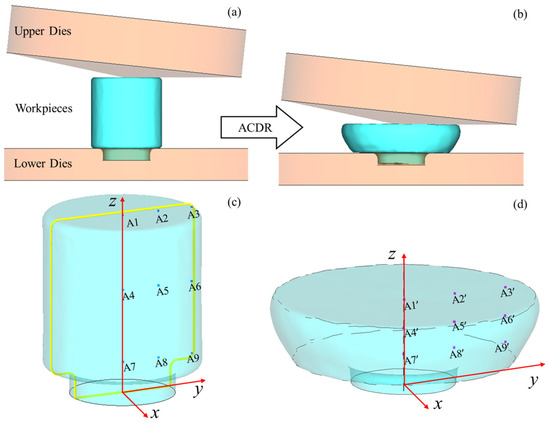 FEM models of the TC11 titanium alloy (a) before ACDR forming, (b) after ACDR forming, and (c) the typical position of the specimen before forming, and (d) the typical position of the specimen after forming.