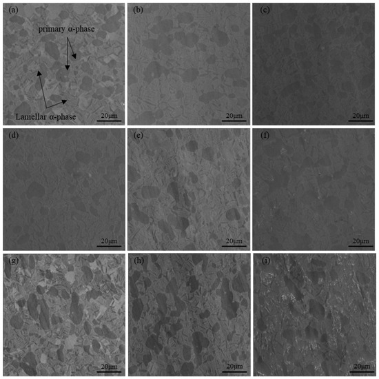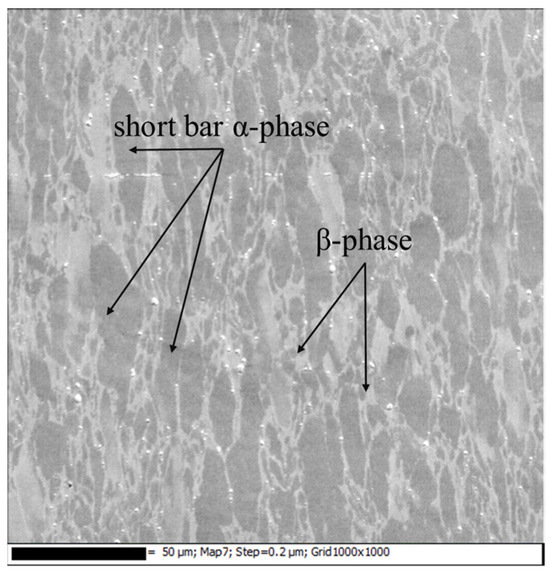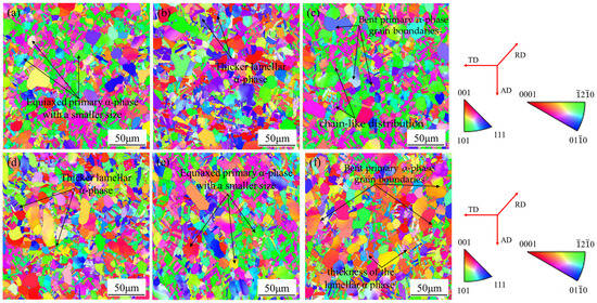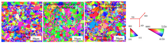 In dual-phase (α + β) titanium alloys, the {0001}/<110> direction of the α-phase is generally aligned with the {110}/<111> direction of the β-phase to maintain a strict Burgers’ orientation [32,33]. This orientation relationship confers a high degree of stability to the structure [34]. To transform titanium alloy from a lamellar structure to an equiaxed structure, it is necessary to disrupt the stability between the α and β phases. The most effective approach to destabilize the phase boundary between the α and β phases, which are co-latticed or semi-co-latticed, is to carry out severe plastic deformation in the two-phase region. During the deformation, differential slip within the α phase induces grain boundary separation, facilitating the transformation of the titanium alloy’s lamellar structure into an equiaxed structure.