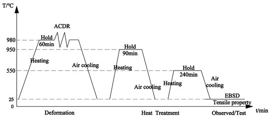 The original bar is cut and made into specimens of Φ60 × 60 mm for the ACDR to form. Its deformation volume is 60% and its deformation temperature is 980 °C, and is subsequently air-cooled to room temperature after forging. After the ACDR forms, the TC11 titanium alloy is heat treated according to the following regime to maximize its mechanical and microstructural characteristics: heating up to 950 °C and holding for 90 min, air-cooled to room temperature, subsequently heating up to 550 °C and holding for 240 min, and air-cooled to room temperature [30]. The general scheme is schematically illustrated in Figure 4.