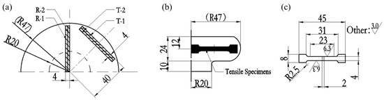 (a) The top and (b) front views of the position of the tensile specimen and (c) the specimen size.