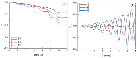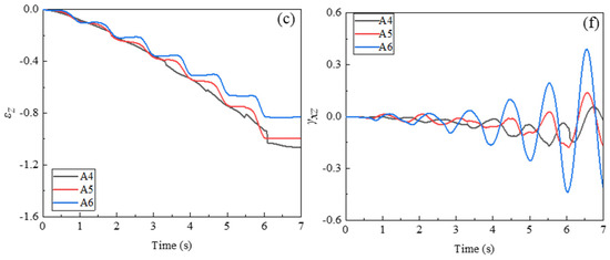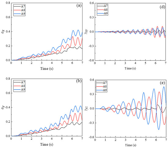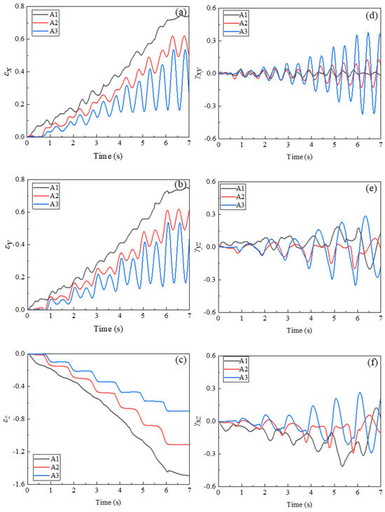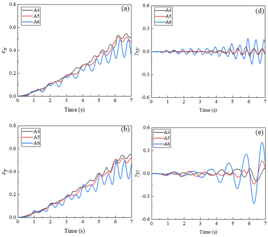 Figure 7d indicates the variation rules of the shear strain γxy over time. As the deformation time increases, the γxy exhibits fluctuate periodically, with the amplitude of the variation gradually increasing. The fluctuation amplitude and γxy gradually increase from the near-center axis to the edge of the specimen, although the increase is modest. The maximum instantaneous strain γxy in the xy plane occurs at the edge, with a maximum value of only 0.17. The patterns of variation in instantaneous strains γyz and γxz with time for ACDR at the H/2 height are shown in Figure 7e,f. As can be observed from the figures, in the yz and xz planes, the instantaneous shear strain of the specimen exhibits a wave-like increase, with the magnitude of change being greater than that of γxy. The fluctuation amplitude and instantaneous shear strain values gradually increase from the center to the edge of the specimen. Accordingly, in the yz and xz planes, the maximum instantaneous strain occurs at the edge of the specimen (A6), with a maximum value approximately 0.4. The ratio of maximum instantaneous shear strain in different planes is γxy:γyz:γxz = 1:2.4:2.4.