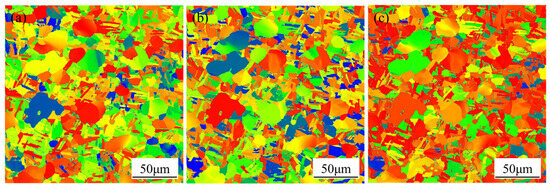 The preparation of EBSD specimen involved the initial polishing of the observation surface, followed by electrolytic polishing using an electrolyte composed of HClO4 and CH3COOH in a ratio of 5:95. During the electrolytic polishing process, the titanium plate is regarded as the cathode, and the electrolytic polishing voltage is 40 V at room temperature for 1~2 min. The EBSD test is performed on a MIRA 3 XMU-type field emission SEM equipped with an EBSD probe, and the appropriate scanning zone is selected according to the grain size with a scanning step of 0.2 μm. After the test, the data are analyzed using the professional EBSD analysis tool, Channel 5 (2019 v5.12).