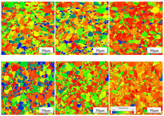 Figure 9 presents the SEM morphology of samples A4’, A5’, and A6’ after the ACDR forming, observed in the xz, yz, and xy planes, respectively. In both the xz and yz planes, the primary α-phase exhibits an equilibrium structure with uniform distribution and small grain polarity. The measured sizes of the grains in the xz plane for A4’, A5’, and A6’ are 11.7 μm, 11.2 μm, and 9.8 μm, respectively, corresponding to maximum shear strains γxz of 0.06, 0.14, and 0.39. In the yz plane, specimens A4’, A5’, and A6’ exhibit maximum shear strains γyz of 0.07, 0.16, and 0.41, respectively, with corresponding grain sizes of 10.9 μm, 11.0 μm, and 10.5 μm. In the xy plane, the titanium alloy structure mainly undergoes torsional deformation, and most of the primary α phase has an elongated rod-like morphology, and the edges of the grain boundaries have a jagged morphology. The average grain sizes of A4’, A5’, and A6’ were measured to be 12.4 μm, 12.1 μm, and 10.9 μm, respectively, corresponding to maximum shear strains γxy of 0.06, 0.04, and 0.17. Larger shear strains promote the bending and torsional deformation of the primary α-phase, leading to smaller grain sizes. Following the ACDR process, the combined effects of torsional and compressive deformation reduce the size of the α-phase in the TC11 titanium alloy. Compared to the initial microstructure (Figure 3), the degree of isotropy increases, and the distribution becomes more uniform.