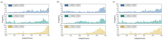Schmid factor distribution statistics of (a) xy plane, (b) xz plane, and (c) yz planes.