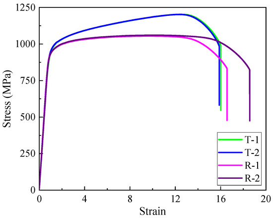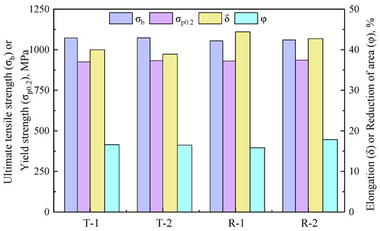 Room temperature tensile tests, including tensile strength (), yield strength , elongation (), and reduction in area (), were conducted using two sets of specimens oriented in tangential direction (T) and radial direction (R) at the H/2 position of the ACDR specimens. The corresponding tensile stress–strain curves at room temperature are depicted in Figure 14. As shown, the differences in tensile strength, yield strength, and elongation between the two groups of specimens are minimal, indicating good reproducibility. Specific mechanical property data are provided in Figure 15, confirming that both the ultimate tensile strength and yield strength of the TC11 titanium alloy, in different directions post-ACDR deformation, remain at elevated levels. In addition to an ultimate tensile strength () exceeding 1030 MPa and a yield strength () exceeding 910 MPa, the reduction in area () is greater than 23% and the elongation () exceeds 8%, both meeting the standards specified in GJB 2218A-2018 [35]. When analyzing the differences between the two directions, it was found that the anisotropy (standard deviation/mean) in strength and elongation were less than 1%, while the anisotropy in cross-sectional shrinkage were below 5%. The mechanical properties of the TC11 titanium alloy disk components formed through ACDR exhibit minimal and highly homogeneous differences across different orientations. As shown in Table 2, the yield strength () of the TC11 titanium alloy produced by the ACDR is lower compared to the conventional (α + β) forged TC11 titanium alloy [36,37]. The torsional deformation present during the ACDR promotes increased slip activity within the titanium alloy structure. Moreover, in the xy plane, the higher tangential strain component enhances the susceptibility to deformation, resulting in a lower yield strength and higher elongation.