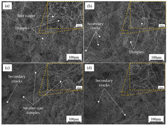 Figure 16a,b present the fiber zone morphology of the tensile fracture of TC11 titanium alloy ACDR specimens in the tangential direction. Both fractures exhibit numerous dimples and tear ridges, characteristic of a ductile fracture. Moreover, a significant number of secondary cracks are observed, which require additional energy for formation, potentially impeding crack propagation and reducing plastic properties. The fiber zone morphology of the tensile fracture surfaces of the ACDR radial specimens is shown in Figure 16c,d. These fractures also demonstrate ductile behavior, primarily characterized by dimples. The smaller size, greater number, and increased depth of these dimples enhance yield properties. Notably, the radial specimens show fewer secondary cracks, which have less influence on the propagation of primary cracks, thereby improving plastic properties.
