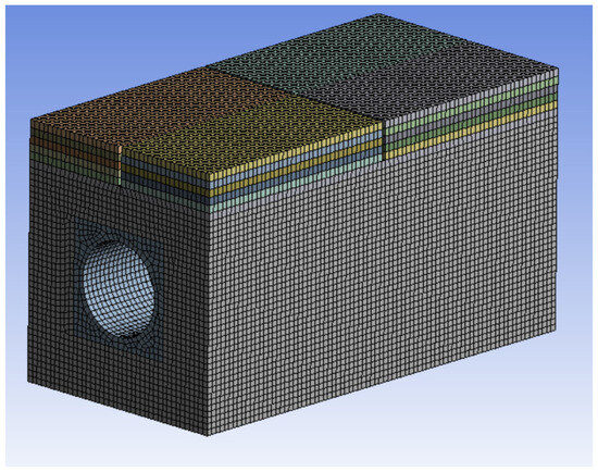 The PFCs model is meshed as shown in Figure 2; the total number of meshes is 120,000 and the element size is 0.0007476 m. This structural simulation assesses the quality of the mesh by examining the element quality. When the element quality is less than 0.7, it is indicative of a more pronounced distortion in the mesh, which will ultimately result in a reduction in accuracy. After the meshing process, the elemental quality is as low as 0.66 with an average value of 0.98, which indicates a good mesh quality.