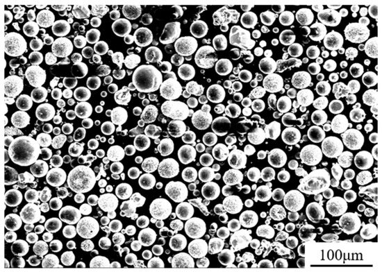 W powders (purity, 99.9%) and Cu powders (purity, 99.9%) (Hebei Yuanyou Metal Materials Co., Xingtai, Hebei, China) were used in this experiment. The particle size of the two raw powders was 15–45 μm. The chemical compositions of the composite powders were W-80 vol% Cu, W-60 vol% Cu, W-40 vol% Cu, and W-20 vol% Cu, respectively. The W–Cu composite powders were prepared by mixing and ball milling the Cu and W powders in a high-energy planetary ball mill for 1.5 h in Ar. Figure 3 shows the morphology of the prepared composite powder.
