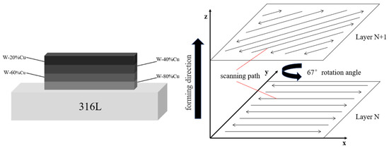 The W–Cu FGMs were processed on a SLM 280 facility (SLM Solutions, Luebeck, Germany) equipped with a 400 W fiber laser. The diameter of beam spot was 70 μm, and the wave length was 1064 nm. Table 1 shows the optimal process parameters of the four kinds of composite powders. Figure 4 shows the preparation process of a W–Cu FGM. Selective laser melting of W-80 vol% Cu, W-60 vol% Cu, W-40 vol% Cu, and W-20 vol% Cu was carried out sequentially by the SLM 280 under argon atmosphere protection. The laser scanned in border and stripes mode with 67° inter-layer rotation. Stainless steel SS 316L (Shanghai Zhewei Metal Group Co., Shanghai, China) was used as the substrate. The dimension of the specimen was 8 mm × 8 mm × 4 mm. The specimens for thermal conductivity, thermal shock performance, and internal stresses were made with dimensions of 10 mm × 10 mm × 4 mm, 20 mm × 20 mm × 4 mm, and 6 mm × 6 mm × 4 mm, respectively.