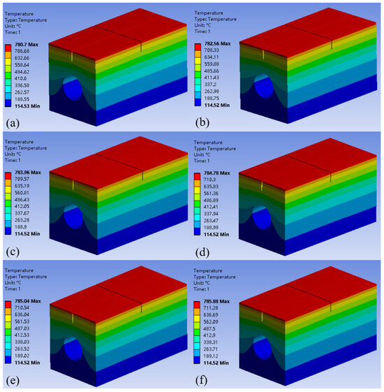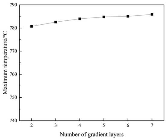 Figure 5 shows the temperature distribution of the PFCs with different numbers of FGM layers at 10 MW/m2; the thickness of the transition layer is 4 mm and the compositional distribution index is 1. It can be observed that the maximum temperature of tungsten armor appears at the top corner of the monoblock; the maximum temperatures of tungsten at different numbers of FGM layers are calculated and listed in Figure 6. The maximum temperature of tungsten increases from 780.7 °C to 785.9 °C when the number of layers increases from two to seven, which means the maximum temperature increases about 1 °C for tungsten per layer added; thus, the increase in the number of gradient layers has less effect on the maximum temperature of the first wall assembly.
