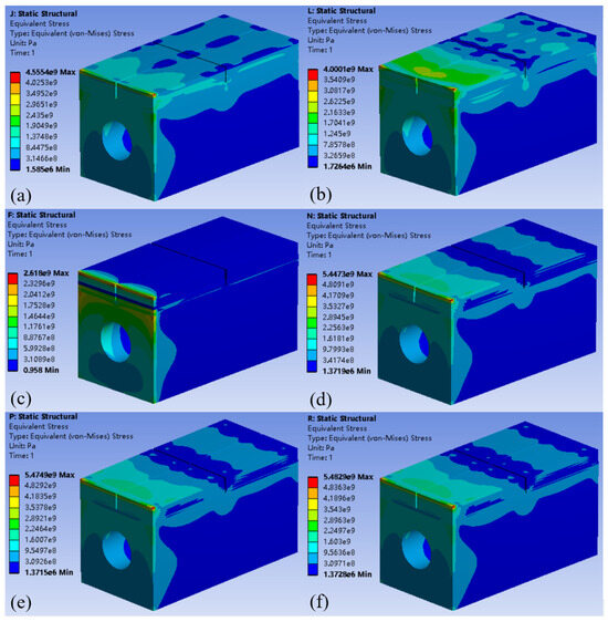 Stress distribution of different gradient layers under a heat load of 10 MW/m2: (a) two layers, (b) three layers, (c) four layers, (d) five layers, (e) six layers, (f) seven layers.