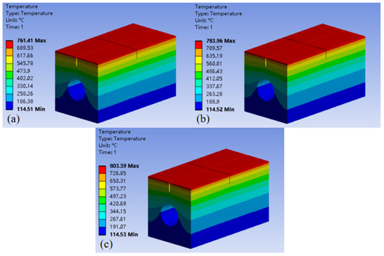 Temperature distribution of different component distribution indices under a heat load of 10 MW/m2: (a) p = 0.6, (b) p = 1, (c) p = 1.4.